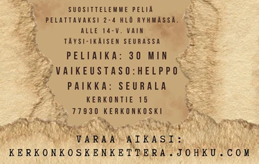 Pakohuonepeli perustuu Seuralan historiaan ja peli on itsenäinen osa Kerkonkosken historiaan sijoittuvaa pelisarjaa. Et kuitenkaan tarvitse aiheesta etukäteistietoa vaan kaikki tarvittava tieto löytyy pelialueelta. Pelin läpäiseminen tapahtuu arvoituksia ratkomalla, kätköjä löytämällä ja tehtäviä suorittamalla.