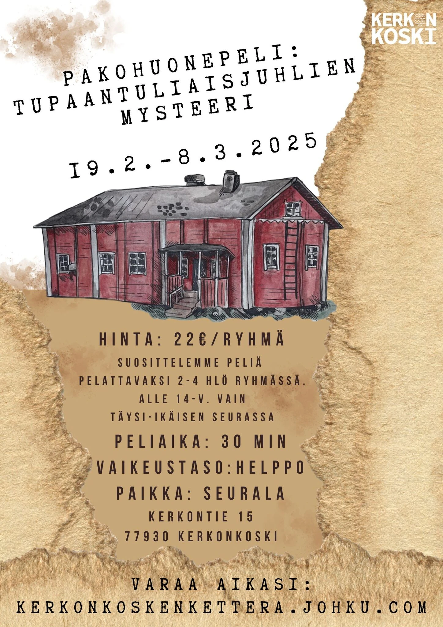Pakohuonepeli: tupaantuliaisjuhlien mysteeri on Kerkonkosken Ketterän suunnittelema ja toteuttama. Pakohuonepelin rahoittaa OLVI-säätiö.